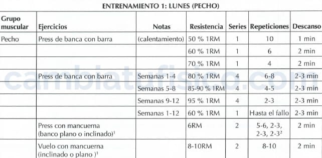 Para las sesiones 1 a 3 (lunes, martes y jueves) durante las semanas 1 a 4 deberá realizar 4 series de 6 a 8 repeticiones de cada ejercicio principal por grupo muscular; para los entrenamientos 1 a 3 en las semanas 1 a 8, hacer 4 series de 4 a 5 repeticiones; y para los entrenamientos 1 a 3 durante las semanas 9 a 12, realizar 4 series de 2 ó 3 repeticiones con el máximo peso posible.